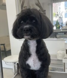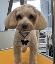 マイクロナノバブル浴のカットコースをご利用のミックス犬(ヨーキー×トイプードル)の小春ちゃんは、体5㎜四肢細くお顔も短くテディベアのご注文です…