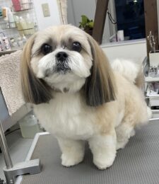 毎月カットコースをご利用のミックス犬(マルチーズ×シーズー)のさくらちゃんは、体1㎝残しの鋏仕上げお顔も短く丸くのご注文です …
