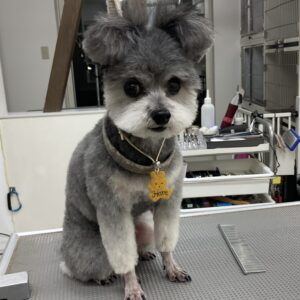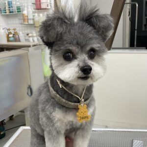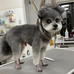 2ヶ月毎にカットコースをご利用のミックス犬(ポメラニアン×トイプードル)のあんくんは、体8㎜お顔は丸くテディベア四肢細く足先バリカン上までのご注文です