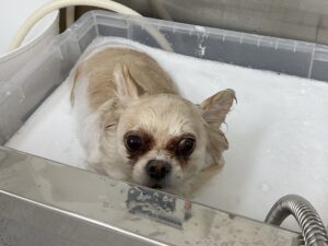 毎月オゾンマイクロナノバブル浴+炭酸泉浴のシャンプーコースをご利用のチワワのくうーくんです
