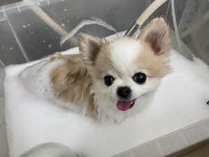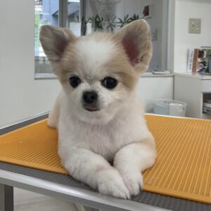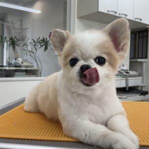 オゾンマイクロナノバブル浴のカットコースをご利用のミックス犬()のくるみちゃんは、体8㎜全バリ尾っぽはライオンのご注文です