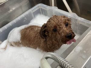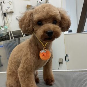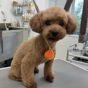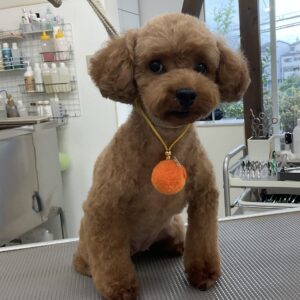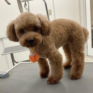 毎月オゾンマイクロナノバブル浴のカットコースをご利用のトイプードルのこえだちゃんは、体5㎜四肢細くお顔はピーナッツカットのご注文です