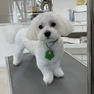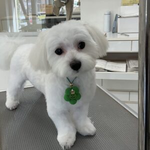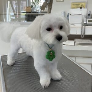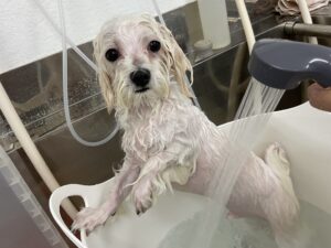 マルチーズのころすけくん、今日は2回目ご来店サービスの炭酸泉浴をお試しです。体8㎜四肢細く口もとふんわり目の上短くのご注文です。炭酸泉浴は血行促進効果があり、キューティクルを引き締めふんわりサラサラに仕上がります。