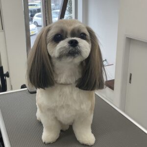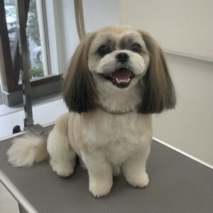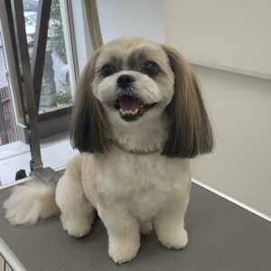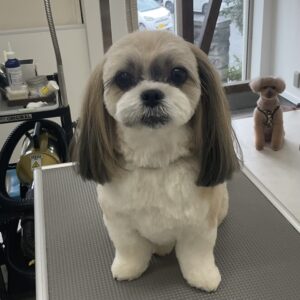 毎月カットコースをご利用のミックス犬(マルチーズ×シーズー)のさくらちゃんは、体1㎝残しの鋏仕上げお顔も短く丸くのご注文です
