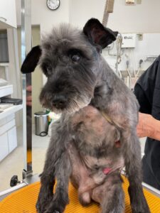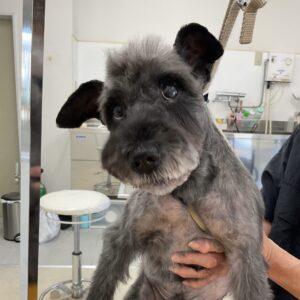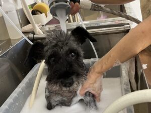 毎月マイクロナノバブル浴+薬浴のカットコースをご利用のM・シュナウザーのしゅーくんは、体3 ㎜四肢5㎜ トップはモヒカン お髭は短くのご注文です。