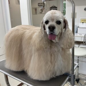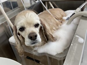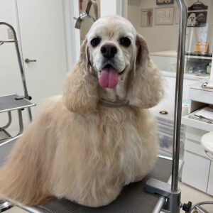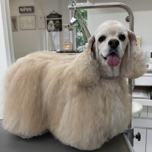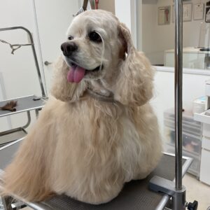 2週間毎にご来店のアメリカンコッカーのねねちゃん、今日はオゾンマイクロナノバブル浴で体3㎜コッカーカットのご注文です