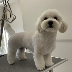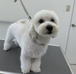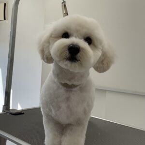 毎月カットコースをご利用のミックス犬(マルチーズ×ダックス)のぶーくんは、体3㎜サマーマイアミ足先バリカンお顔も短く丸くのご注文です