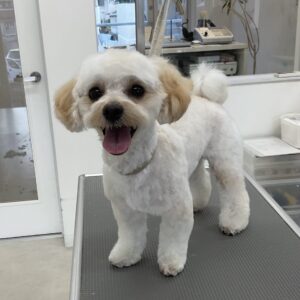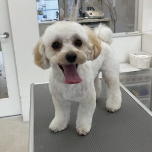 体6㎜テディベアカットをご利用のミックス犬(マルプー)のぽてとくん、今日は2回目のご来店で炭酸泉浴のお試しです。炭酸泉浴は温浴効果で新陳代謝を活発にし、被毛のキューテクルを引き締めてふんわりサラサラに仕上がります。