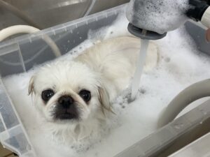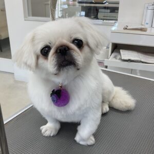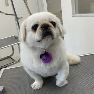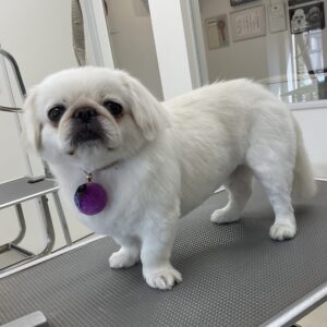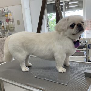 毎月オゾンマイクロナノバブル浴のカットコースをご利用のペキニーズのまろちゃんは、体サイド胸お尻を短く鋏仕上げのご注文です
