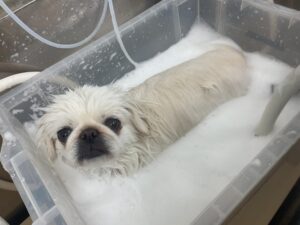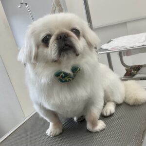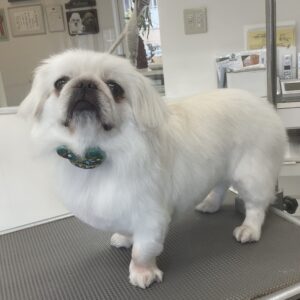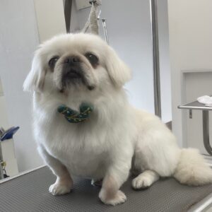 毎月オゾンマイクロナノバブル浴のカットコースをご利用のペキニーズのまろちゃんは、体サイド胸お尻を短く鋏仕上げのご注文です