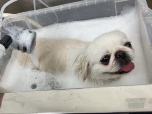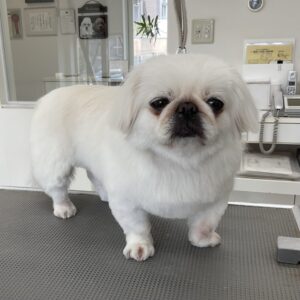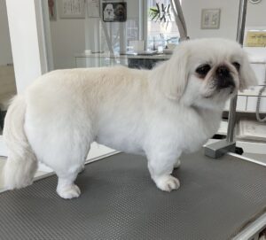毎月オゾンマイクロナノバブル浴のカットコースをご利用のペキニーズのまろちゃんは、体サイド胸お尻を短く鋏仕上げのご注文です