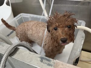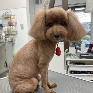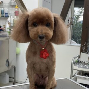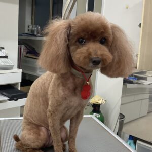 1.5ヶ月毎にオゾンマイクロナノバブル浴のカットコースをご利用のT・プードルのむーんちゃんは、あーすくんと一緒にご来店です。体2㎜の全バリお顔はすっきりテディベアのご注文です。