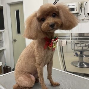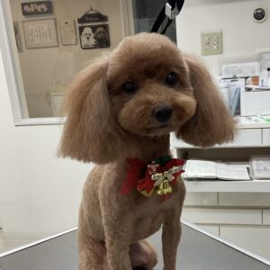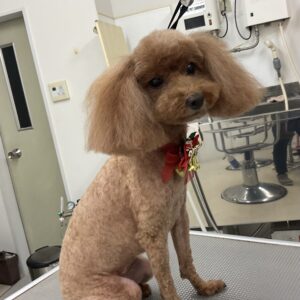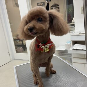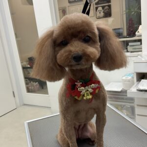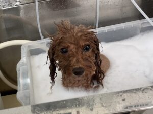 1.5ヶ月毎にオゾンマイクロナノバブル浴のカットコースをご利用のT・プードルのむーんちゃんは、あーすくんと一緒にご来店です。体2㎜の全バリお顔はすっきりテディベアのご注文です。