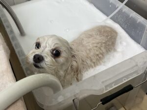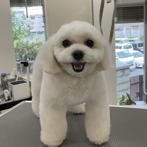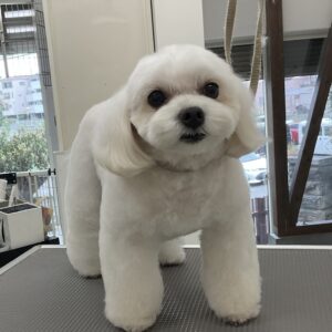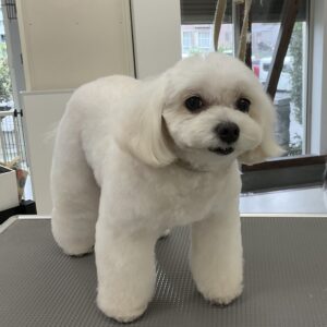 ⒈5ヶ月毎にオゾンマイクロナノバブル浴+炭酸泉浴のカットコースをご利用のマルチーズのゆあくんは、体10㎜四肢太くお顔は丸くのご注文です。