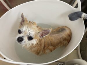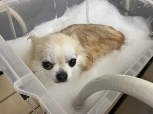 2ヶ月毎にオゾンマイクロナノバブル浴+炭酸泉浴のシャンプーコースをご利用のチワワのアポロくんです