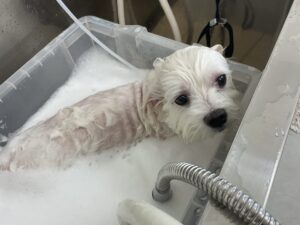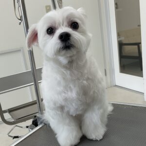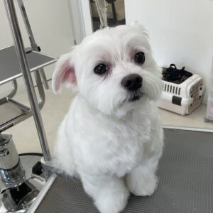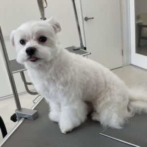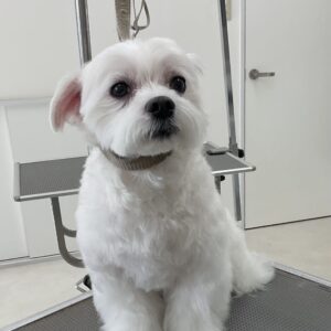 毎月オゾンマイクロナノバブル浴のカットコースをご利用のマルチーズのカノタンくんは、体3㎝残し お顔はふっくら自然な感じで 四肢太く 足元短く のご注文です。