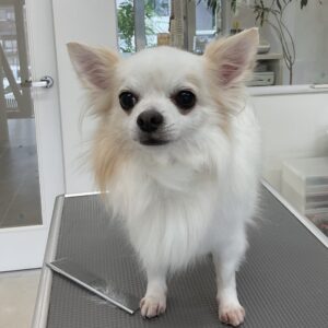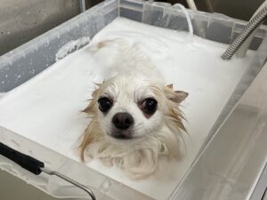 2ヶ月毎にマイクロナノバブル浴+炭酸泉浴のシャンプーコースをご利用のチワワのコハクくんです