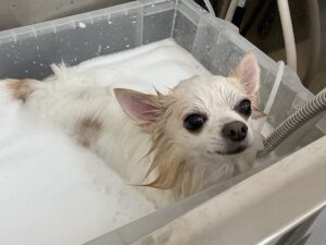2ヶ月毎にマイクロナノバブル浴+炭酸泉浴のシャンプーコースをご利用のチワワのコハクくんです