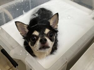 毎月オゾンマイクロナノバブル浴+炭酸泉浴のシャンプーコースをご利用のスムースチワワのサンディちゃんです