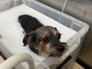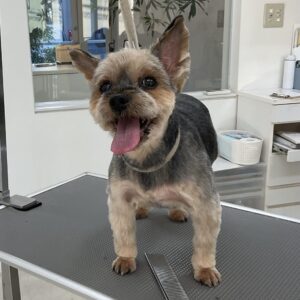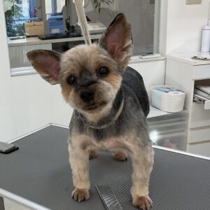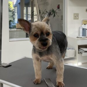 2ヶ月毎にマイクロナノバブル浴のカットコースをご利用のヨーキーのシンバくんは、T・プードルのチップちゃんと一緒にご来店です。体3㎜ 口元ふっくら 四肢細く 足先短くのご注文です。