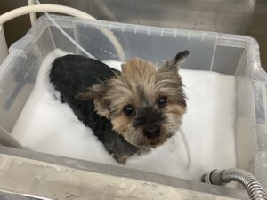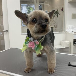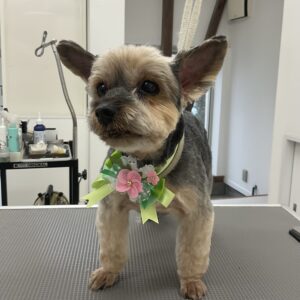 2ヶ月毎にマイクロナノバブル浴のカットコースをご利用のヨーキーのシンバくんは、T・プードルのチップちゃんと一緒にご来店です。体3㎜ 口元ふっくら 四肢細く 足先短くのご注文です。
