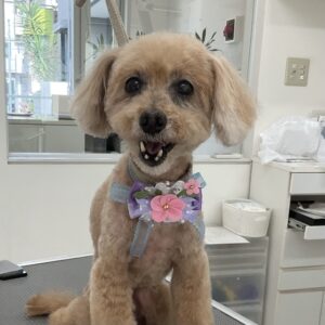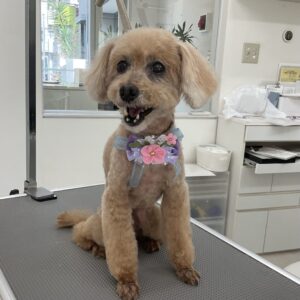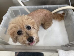 2ヶ月毎にマイクロナノバブル浴のカットコースをご利用のT・プードルのチップちゃんは、ヨーキーのシンバくんと一緒にご来店です。体3㎜のテディベア口元ふっくら 四肢細く 足先短くのご注文です。