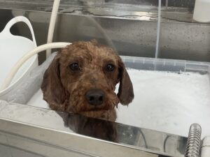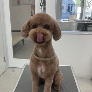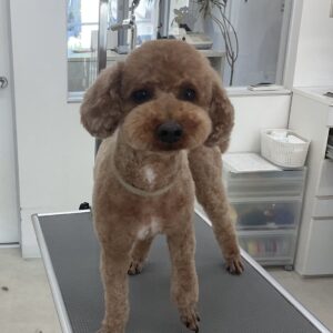 2ヶ月毎にオゾンマイクロナノバブル浴+歯磨きのカットコースをご利用のトイプードルのチョコくんは、体5㎜全バリお顔も短くテディベアのご注文です