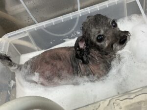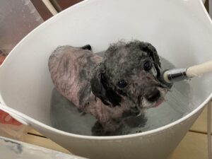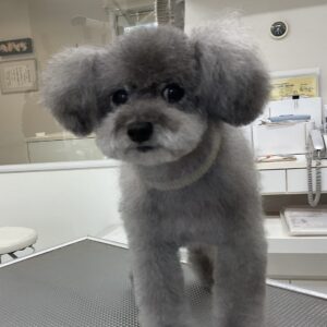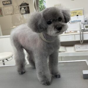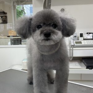 ⒈5ヶ月毎にオゾンマイクロナノバブル浴+炭酸泉浴のカットコースをご利用のT・プードルのハルくんは、マロンくんと一緒にご来店です。体10㎜ ふっくらテディベアカット四肢細くのご注文です。