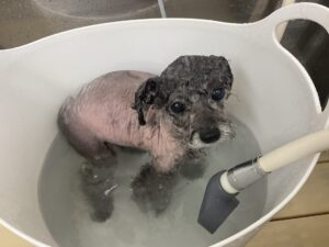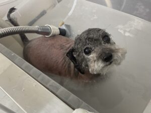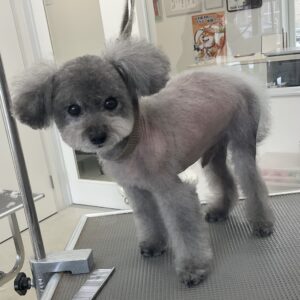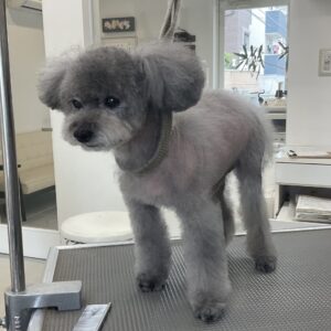 ⒈5ヶ月毎にオゾンマイクロナノバブル浴+炭酸泉浴のカットコースをご利用のT・プードルのハルくんは、マロンくんと一緒にご来店です。体10㎜ ふっくらテディベアカット四肢細くのご注文です。