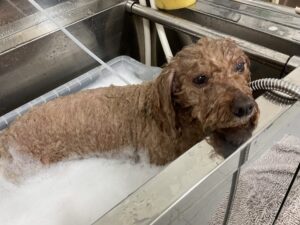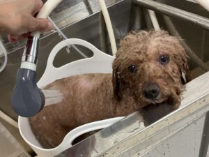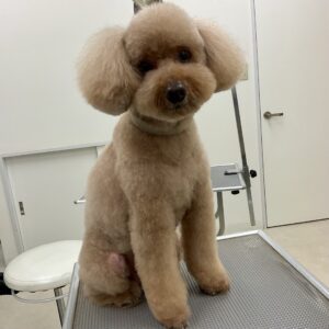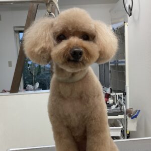 ⒈5ヶ月毎にオゾンマイクロナノバブル浴+炭酸泉浴のカットコースをご利用のT・プードルのマロンくんは、ハルくんと一緒にご来店です。体8㎜ 四肢細く ふっくらテディベアのご注文です。