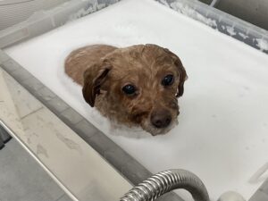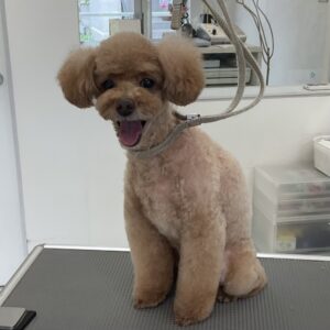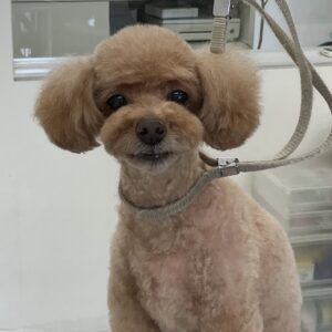 ⒈5ヶ月毎にオゾンマイクロナノバブル浴+歯磨きのカットコースをご利用のトイプードルのメルちゃんは、体5㎜四肢細く指先短くお顔はフェイスラインに沿って短くムスタッシュも小さく丸くのご注文です