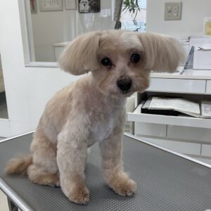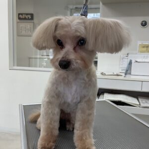 2ヶ月毎にオゾンマイクロナノバブル浴のカットコースをご利用のミックス犬(マルチーズ×トイプードル)のモカちゃんは、体5㎜テディベア四肢細くお耳は大きく丸くのご注文です