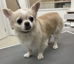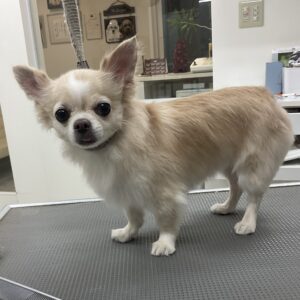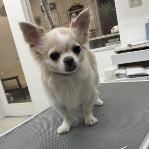 ご新規でシャンプーコースをご利用のチワワの7歳モモちゃんです。今日は初回サービスのオゾンマイクロナノバブルのお試しで手触り艶やかふんわりシルキーコートの仕上がりです