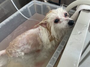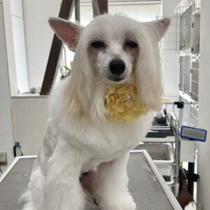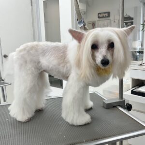 毎月マイクロナノバブル浴のカットコースをご利用のチャイニーズクレステッドドッグのユーリちゃんは体5㎜お顔は鋏で短く顔バリ様にトップからキ甲迄は長くのご注文です