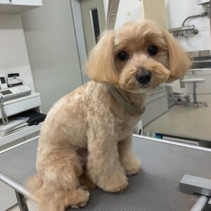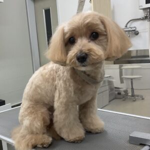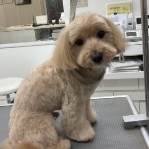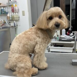 1.5ヶ月毎にカットコースをご利用のミックス犬(マルチーズ×トイプードル)のライムくんは、体6㎜テディベア丸く四肢細めのベルボトムのご注文です