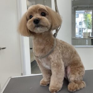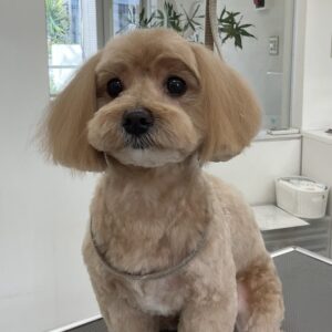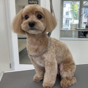 1.5ヶ月毎にカットコースをご利用のミックス犬(マルチーズ×トイプードル)のライムくんは、体6㎜テディベア丸く四肢細めのベルボトムのご注文です