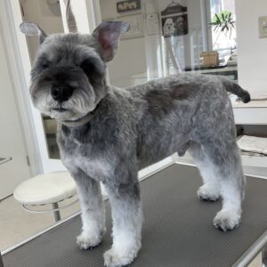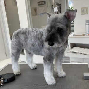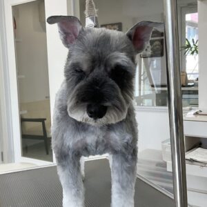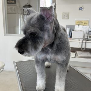 2ヶ月毎にカットコースをご利用のミニチュアシュナウザーのルウくんは、体5㎜四肢細くトップは5㎜マズル小さく丸くご注文です
