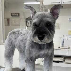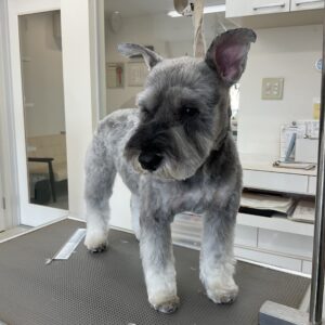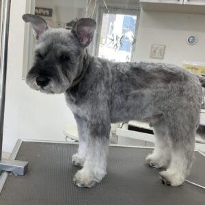 2ヶ月毎にカットコースをご利用のミニチュアシュナウザーのルウくんは、体5㎜四肢細くトップは5㎜マズル小さく丸くご注文です