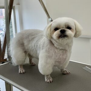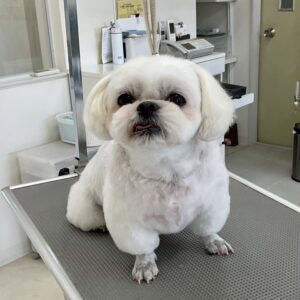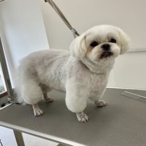毎月ご来店のミックス犬(ペキニーズ×ビションフリーゼ)のルナちゃん、今日は体5㎜四肢太く足先バリカンお顔は短く丸くのカットコースをご利用です