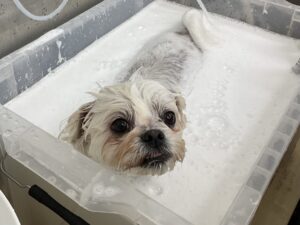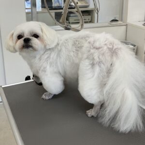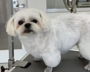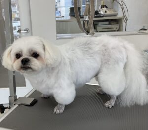 毎月ご来店のミックス犬(ペキニーズ×ビションフリーゼ)のルナちゃん、今日はシャンプーコースで足先バリカンお顔は短く丸くのご注文です