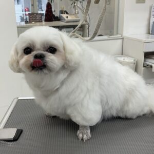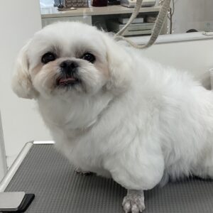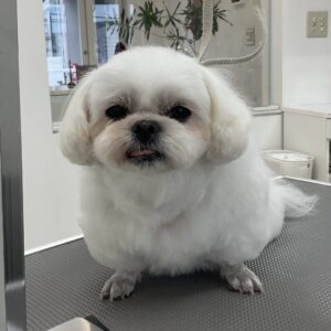 毎月ご来店のミックス犬(ペキニーズ×ビションフリーゼ)のルナちゃん、今日は体シャンプーコースで足先バリカンお顔は短く丸くのご注文です