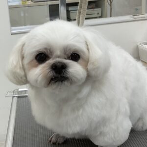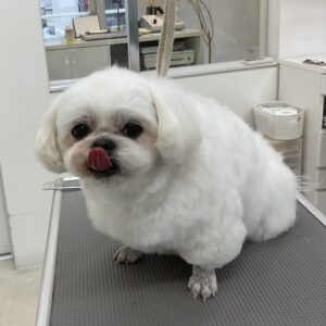 毎月ご来店のミックス犬(ペキニーズ×ビションフリーゼ)のルナちゃん、今日はシャンプーコースで足先バリカンお顔は短く丸くのご注文です