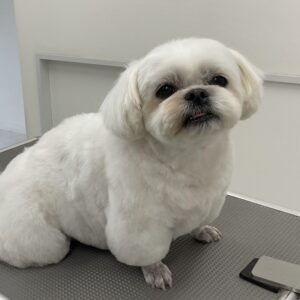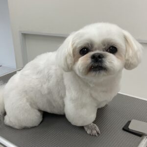 毎月ご来店のミックス犬(ペキニーズ×ビションフリーゼ)のルナちゃん、今日は体5㎜四肢太く足先バリカンお顔は短く丸くのカットコースをご利用です