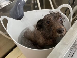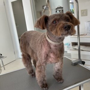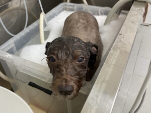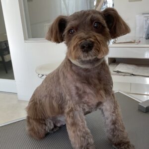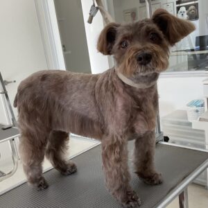 1.5ヶ月毎にオゾンマイクロナノバブル浴+炭酸泉浴のカットコースをご利用のM・シュナウザーのルルちゃんは、体2㎜ 四肢揃えてお顔は頬3㎜ トップは5㎜のシュナウザーカットのご注文です。