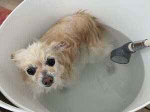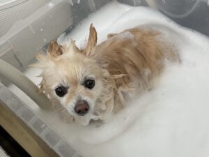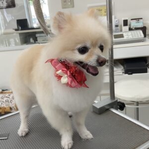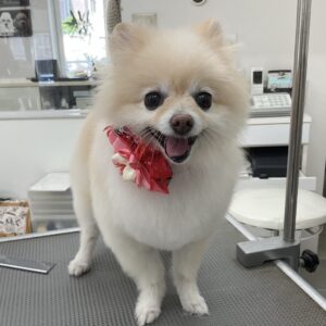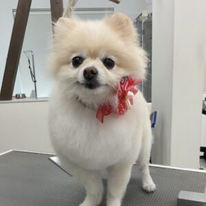 2ヶ月毎にオゾンマイクロナノバブル浴+炭酸泉浴の鋏仕上げのカットコースをご利用のポメラニアンのヴィヴィちゃんです