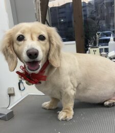 2ヶ月毎にオゾンマイクロナノバブル浴+炭酸泉浴のカットコースをご利用のミニチュアダックスプリンちゃんは、体2㎜全バリのご注文です…