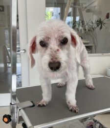 2ヶ月毎にカットコースをご利用のミックス犬(マルチーズ×プチバセット)の17歳ロビンくんは、体6㎜四肢細く足先バリカンお顔も短く丸のご注文です…