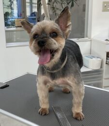 毎月カットコースをご利用のヨーキーのごえもんくんは、体3㎜四肢細くお顔は丸くお耳は揃えます…
