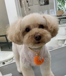 毎月ご来店のミックス犬(ペキニーズ×ビションフリーゼ)のルナちゃん、今日は体5㎜四肢太く足先バリカンお顔は短く丸くのカットコースをご利用です…