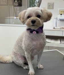 2ヶ月毎にオゾンマイクロナノバブル浴のカットコースをご利用のミックス犬(トイプードル×マルチーズ)の麦ちゃんは、体5㎜のテディベア四肢細くお耳も短くのご注文です…